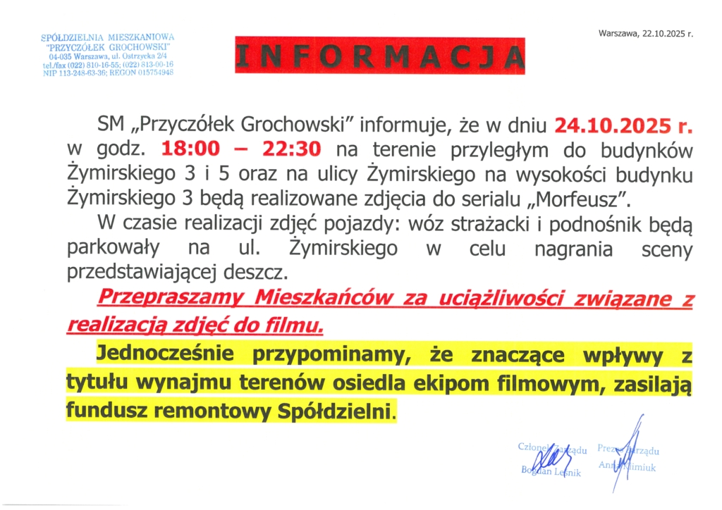 Ekipa filmowa na Osiedlu marta2025-10-23T10:00:41+02:00 Related Posts HARMONOGRAM PRZEGLĄDU INSTALACJI GAZOWEJ ORAZ WENTYLACJI GRAWITACYJNEJ W LOKALACH BUDYNKÓW SM „PRZYCZÓŁEK GROCHOWSKI” – termin I HARMONOGRAM PRZEGLĄDU INSTALACJI GAZOWEJ ORAZ WENTYLACJI GRAWITACYJNEJ W LOKALACH BUDYNKÓW SM „PRZYCZÓŁEK GROCHOWSKI” – termin I 24. października. 2025 Bon ciepłowniczy Bon ciepłowniczy 24. października. 2025 Niszczenie mienia na Osiedlu Niszczenie mienia na Osiedlu 21. października. 2025 Miejsca doraźnego schronienia Miejsca doraźnego schronienia 16. października. 2025 Awaria telefonów stacjonarnych Awaria telefonów stacjonarnych 16. października. 2025