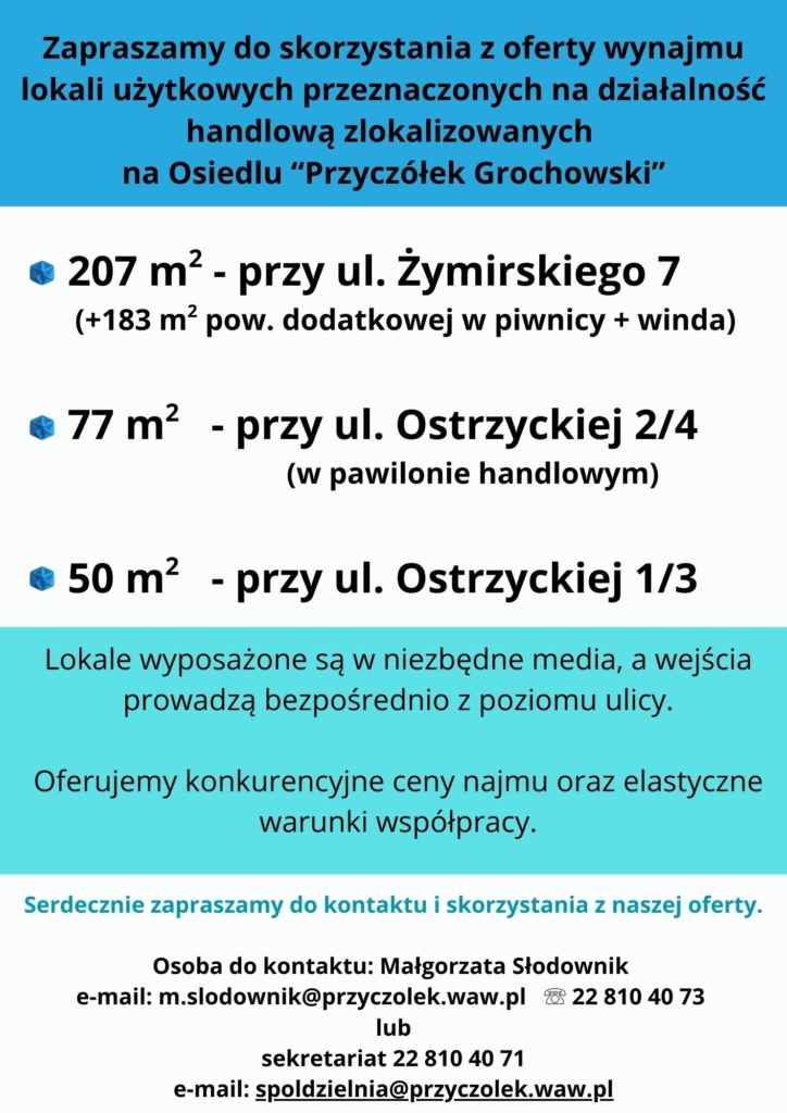 Lokale użytkowe do wynajęcia marta2025-12-17T10:52:44+01:00 Related Posts OSTATECZNY termin (III) przeglądu inst. gazowej oraz went. grawitacyjnej OSTATECZNY termin (III) przeglądu inst. gazowej oraz went. grawitacyjnej 11. grudnia. 2025 Przedłużanie zezwoleń na wjazd Przedłużanie zezwoleń na wjazd 03. grudnia. 2025 Nowa firma ochrony Nowa firma ochrony 02. grudnia. 2025 Remont galerii Żymirskiego 3 Remont galerii Żymirskiego 3 26. listopada. 2025 Przegląd instalacji gazowej i wentylacji grawitacyjnej – termin II Przegląd instalacji gazowej i wentylacji grawitacyjnej – termin II 20. listopada. 2025