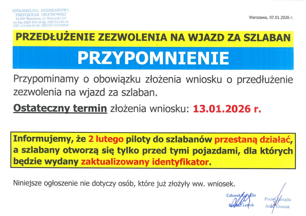 Przypomnienie – wjazd za szlaban marta2026-01-07T13:50:40+01:00 Related Posts BRAK ZIMNEJ WODY – Żymirskiego 3 BRAK ZIMNEJ WODY – Żymirskiego 3 08. stycznia. 2026 Awaria e-usług Awaria e-usług 08. stycznia. 2026 Nadzwyczajne Walne Zgromadzenie – 26 stycznia Nadzwyczajne Walne Zgromadzenie – 26 stycznia 22. grudnia. 2025 Lokale użytkowe do wynajęcia Lokale użytkowe do wynajęcia 17. grudnia. 2025 OSTATECZNY termin (III) przeglądu inst. gazowej oraz went. grawitacyjnej OSTATECZNY termin (III) przeglądu inst. gazowej oraz went. grawitacyjnej 11. grudnia. 2025