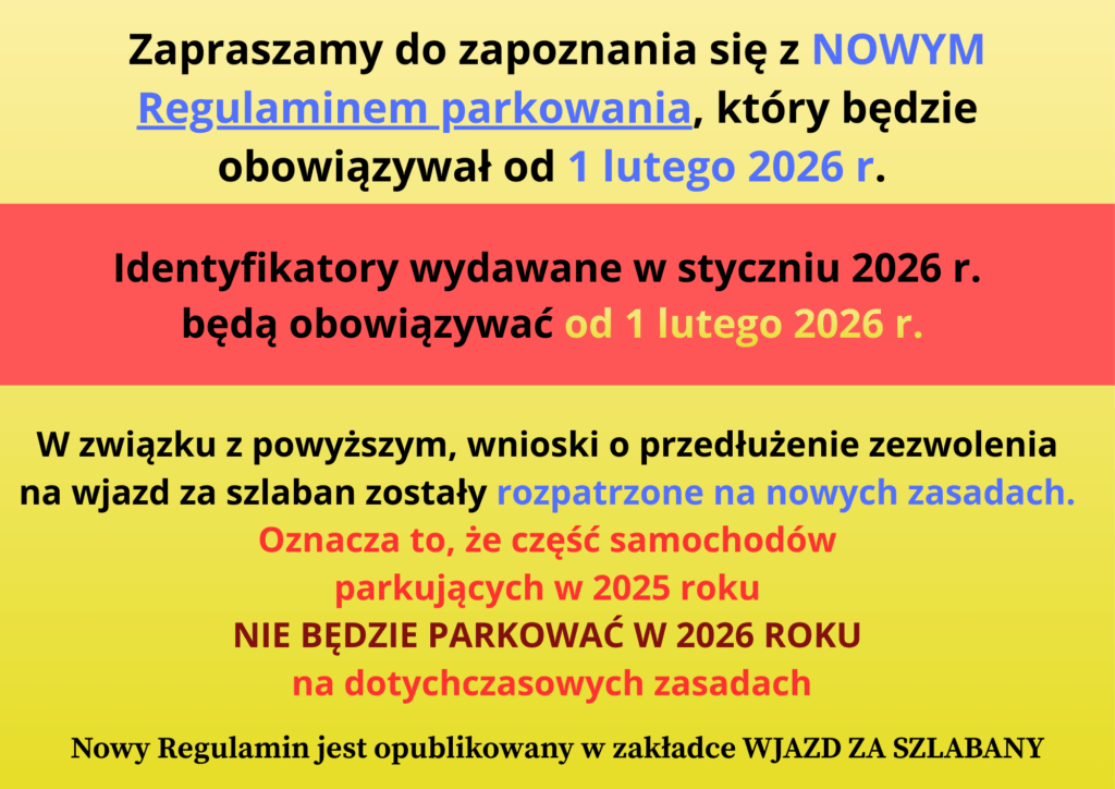 WAŻNE ZMIANY – Nowy Regulamin parkowania marta2026-01-15T10:45:16+01:00 Related Posts Wydawanie zezwoleń na wjazd Wydawanie zezwoleń na wjazd 15. stycznia. 2026 Komunikat dot. zezwoleń na wjazd Komunikat dot. zezwoleń na wjazd 13. stycznia. 2026 BRAK ZIMNEJ WODY – Żymirskiego 3 BRAK ZIMNEJ WODY – Żymirskiego 3 08. stycznia. 2026 Awaria e-usług Awaria e-usług 08. stycznia. 2026 Przypomnienie – wjazd za szlaban Przypomnienie – wjazd za szlaban 07. stycznia. 2026
