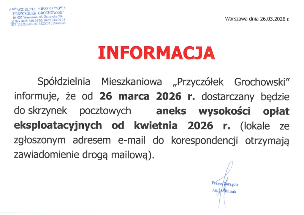 Zmiana wysokości opłat od kwietnia marta2026-03-26T10:09:16+01:00 Related Posts Życzenia na Wielkanoc Życzenia na Wielkanoc 30. marca. 2026 Wymianę pionów instalacji wody zimnej, ciepłej i cyrkulacji w budynku Cyrklowa 6 Wymianę pionów instalacji wody zimnej, ciepłej i cyrkulacji w budynku Cyrklowa 6 17. marca. 2026 Jednorazowy wjazd za szlaban Jednorazowy wjazd za szlaban 13. marca. 2026 Lokale do wynajęcia Lokale do wynajęcia 18. lutego. 2026 Koszty CO Koszty CO 10. lutego. 2026